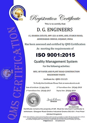 SINCE 1990, D G ENGINEERS was founded.Professionally working at spare parts for road construction machinery,Such as SENSOR PAVER, HOT MIX PLANT,WMM PLANT, KERB PAVER, ASPHALT PLANT , ASPHALT PAVER, SLIPFORM PAVER, ETC machinery .Also working at Repairing construction machinery &.Technical service.
